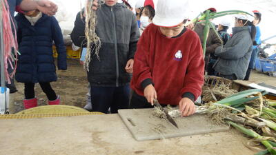 子どもたちは、農家の方に教えていただきながら、「根を包丁で切り落とす」「葉を3本まで残すように整える」「機械を使って外の皮を剥く」「機械で根元から60㎝のところまで葉を切る」「表裏を揃えてテープでまとめる」作業を一つ一つ丁寧に行いました。