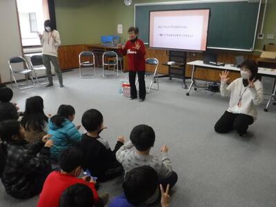 役場健康福祉課の宮田さん、おひさまの家の西澤さん、スポーツ指導員の齋藤さんにお越しいただき、スライドやDVDを使いながら、認知症についてや対応方法について分かりやすく教えていただき、手遊びやあやとりなど、お年寄りと一緒にできる活動を紹介していただきました。